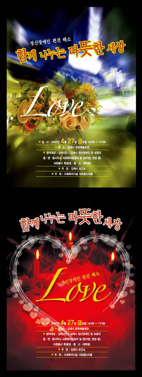 예쁜 누님 우선 아래것이 따뜨하구요 함께나누는따뜻한세상을 로고화 시켜서 크기를 크고 작게 다양하게 글씨에 크기변화를 주시고 색은 흰색만으로 하는 것이 좋을 듯해요. 하트 선도 굵고 얇게 다양하게 주면서 몇가닥은 빼구요.. 여튼 넘 벗지네요. 예쁜 누님